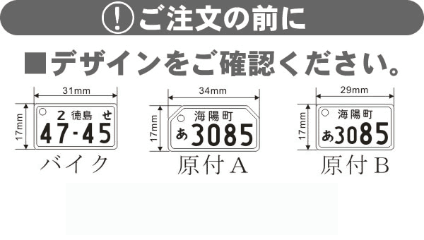 メーカー アルタシステム サイズ 台形 34×17×3mm 長方形 29×17×3mm バイク 31×17×3mm プレートカラー クリア (文字を彫刻) クリアブルー (背景透明/白文字) クリアピンク (背景透明/白文字) 取り付け金具 黒ストラップ(約50mm)※iPhone対応イヤホンジャック付 ピンクストラップ(約50mm)※iPhone対応イヤホンジャック付 キーホルダー金具 対応デザイン 小型バイク 原付バイク ※国内ナンバー限定 ※実物に似せて製作しますので不要な数字(記号)は当店の判断で修正いたします。